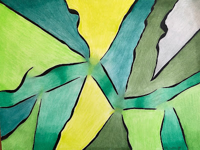 I made this in August 2013. I was not having a good day. I started with the black lines using India ink. Then I began experimenting with greens using color pencils. I finished by rubbing the pigments with a piece of cloth. Two hours later, it was completed and I was smiling with the result. By the way, my favorite color is green.
